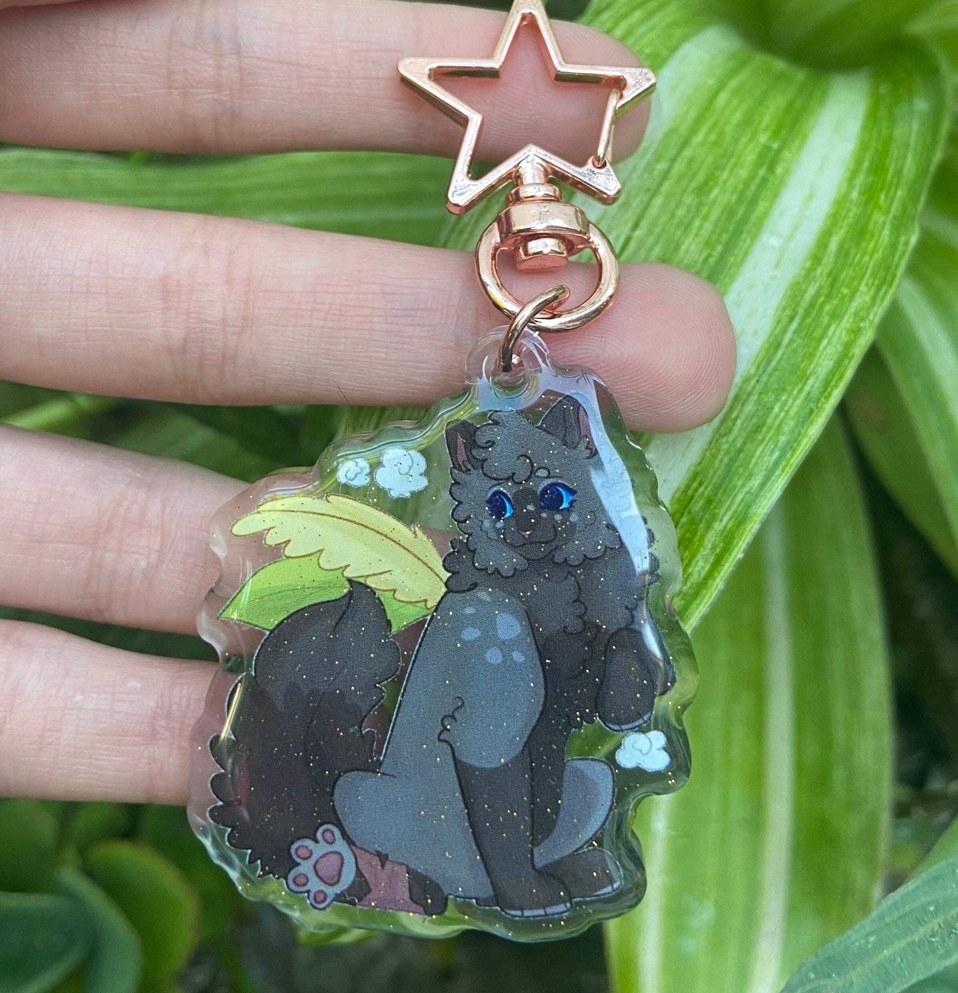 Acrylic double sided 2β Keychain! This charm comes with one side holographic glitter epoxy , plus the loved character, Cinderpelt from the Warriors Series. It has a rose gold star clasp.