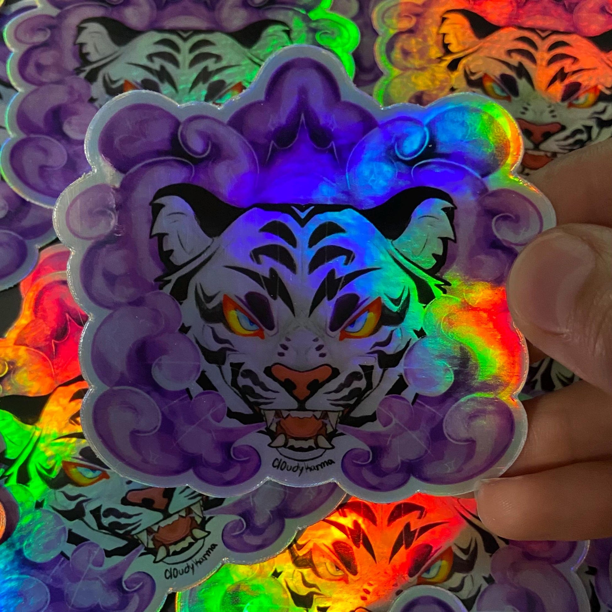 3x3 Holographic Vinyl Sticker of a White Tiger. It's a waterproof material.